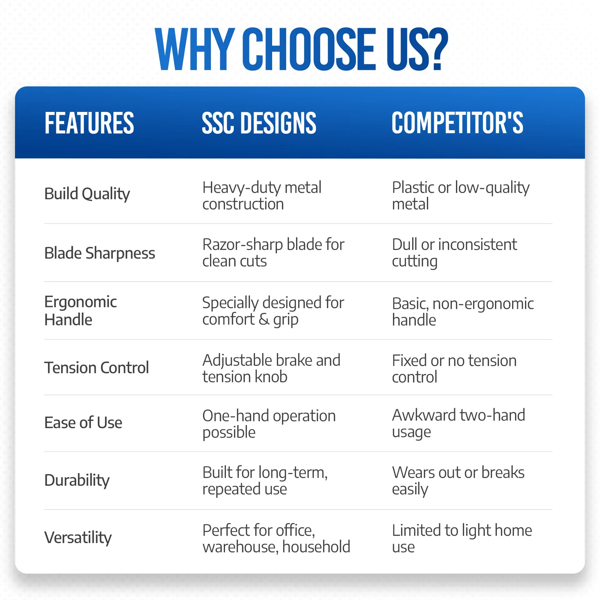 - Equipped with a sharp blade that makes cutting and applying tape a comfort, a smart product for any small business. Its portable basic frame rolls yards of tape with ease