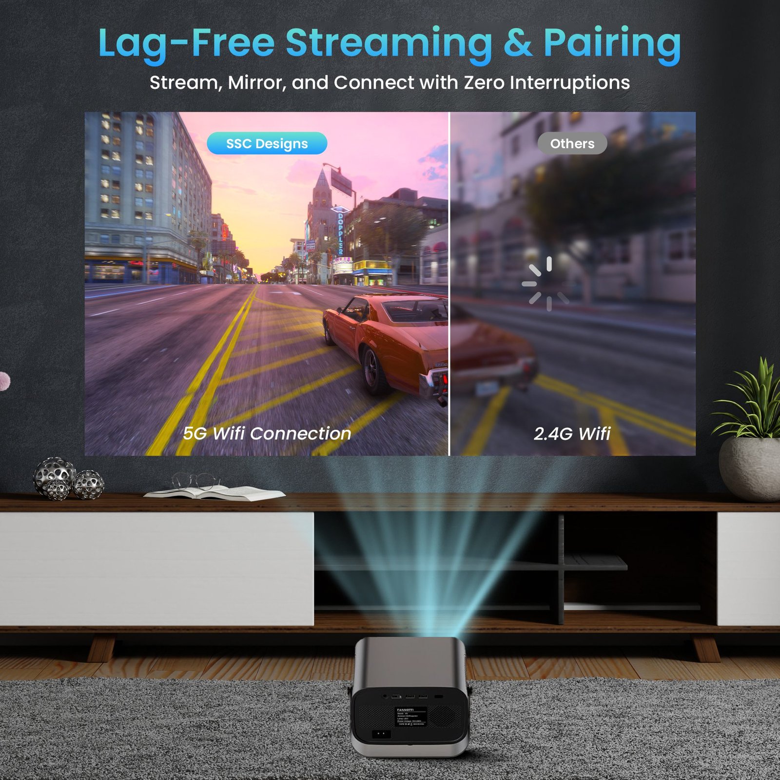 - Native 1080p Wireless projector system with built-in Wifi and Bluetooth that can support various entertainment devices including smartphones, consoles, controllers, soundbar audio, and many more devices.